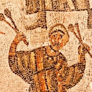 Ancient Egyptian mosaic of man playing cymbals in Roman Period
